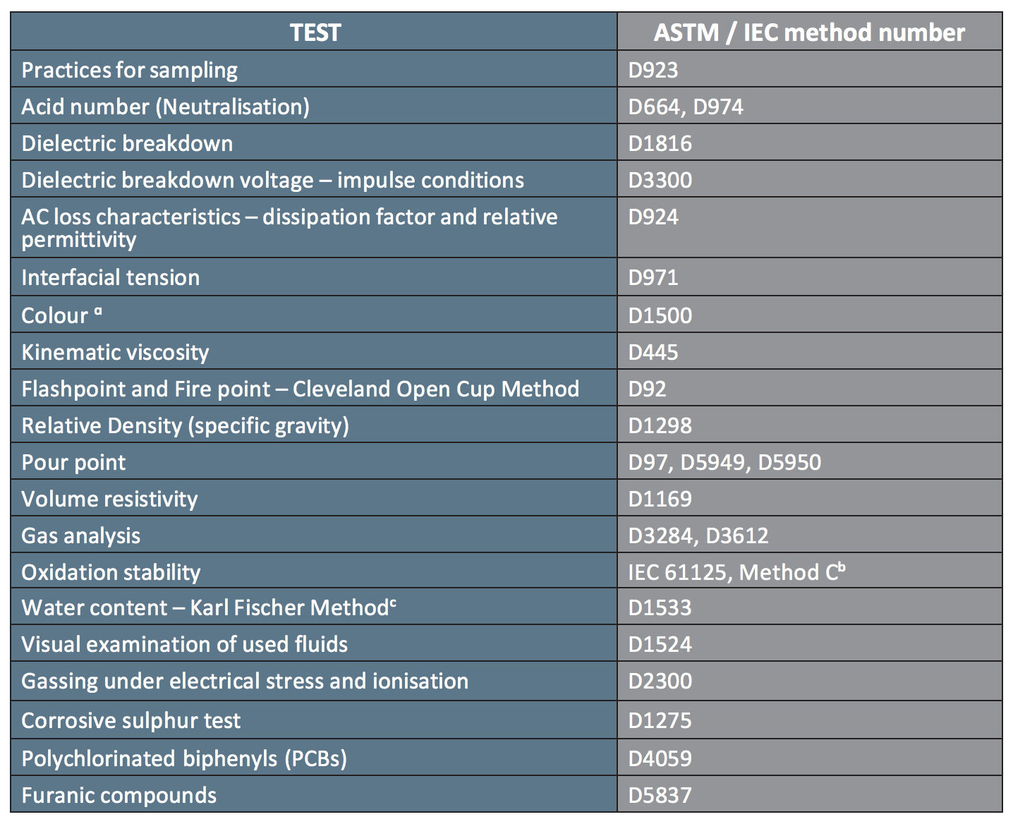 ᶜ Alternative reagents as listed in ASTM D1533 for natural esters as modified in IEC 62770, Annex A (reducing test duration from 164h to 48h).