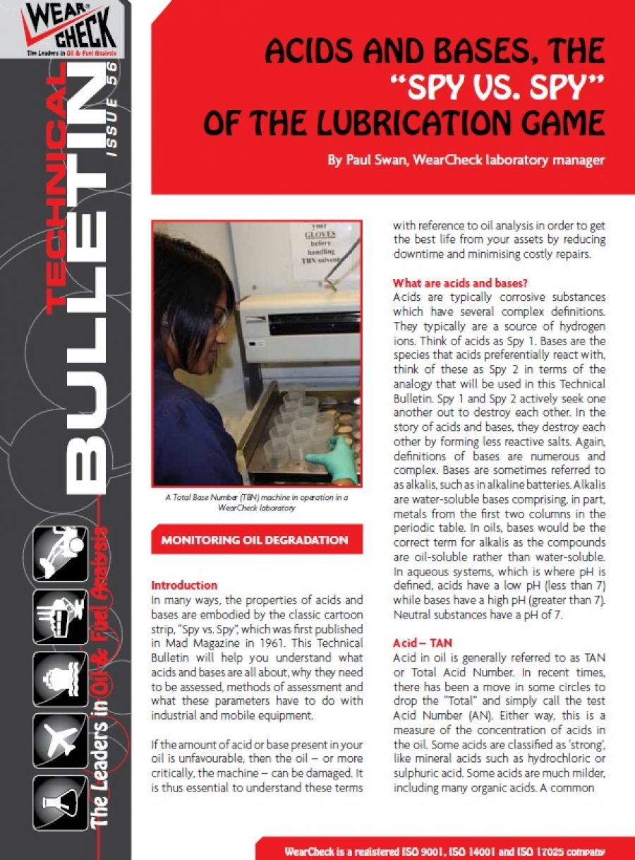 Technical Bulletin 56 explores the properties of acids and bases and their influence on lubricants. The importance of assessing acids and bases is discussed, as are the methods of assessment, and the positive and negative effects of acids and bases on industrial and mobile equipment.