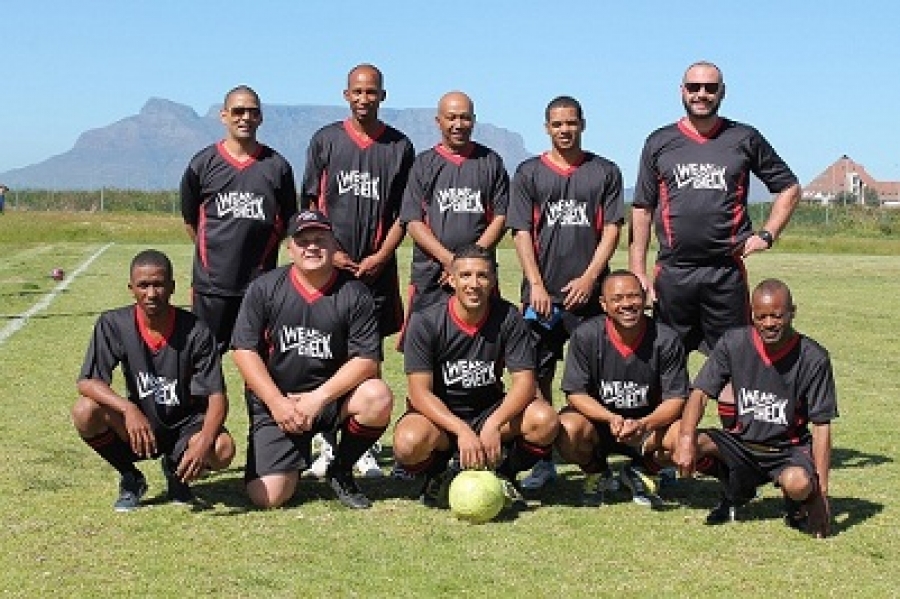 Players in the successful WearCheck Warriors football team were: Back row (left to right): Charlton Fortuin, Rendall van Ryhn, Hoosain Sydow, Bertram Snell, and Bradley Roode Front row (left to right): Ndiphe Gqolodashe, Werner Buys (team captain), Dominic Chanyan, Ashley Davids, and Kenneth Mubeti